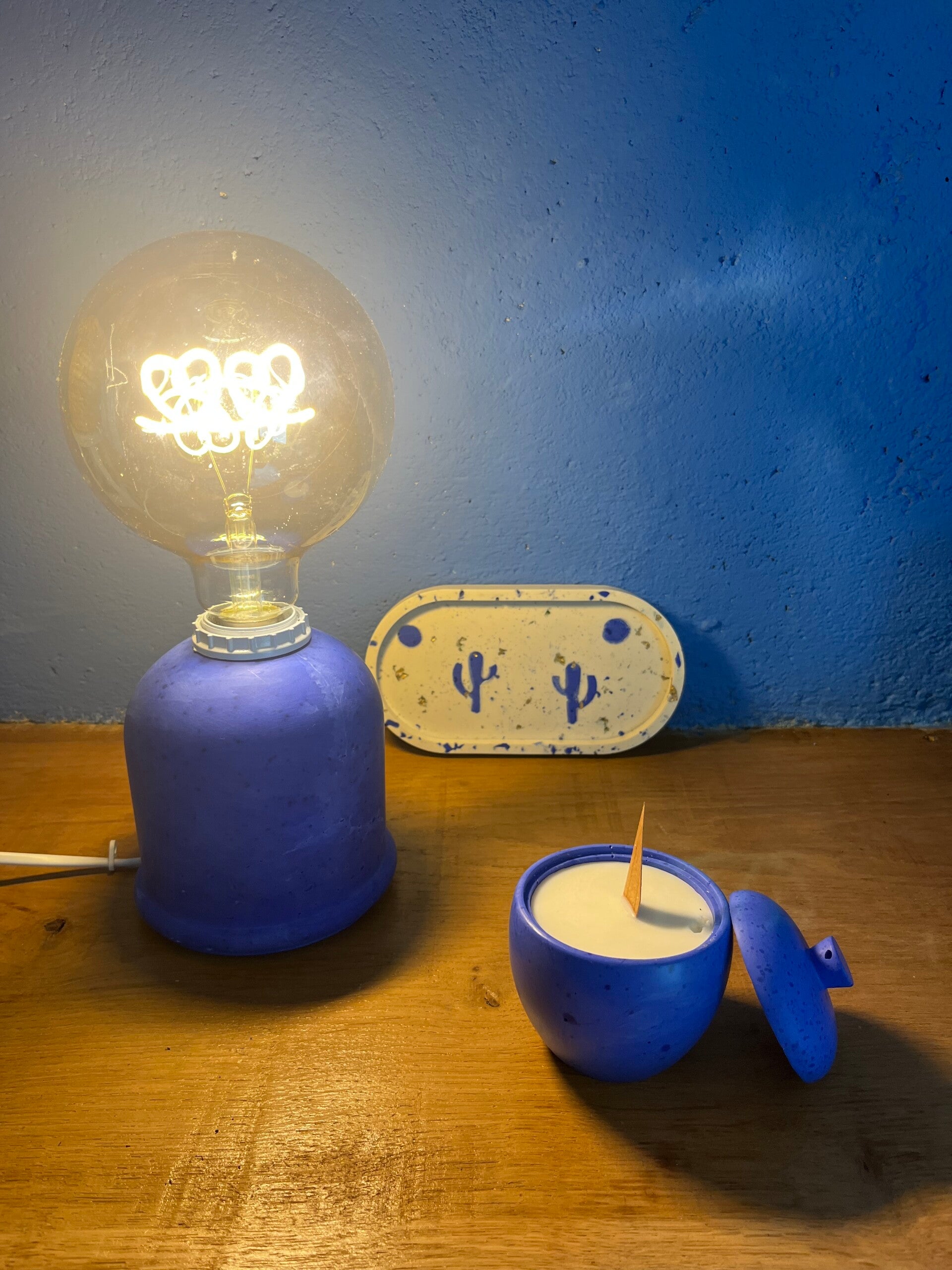 Cette bougie aux pigments bleu outre-mer a été réalisée en jesmonite. Son couvercle vous permettra de recouvrir le pot une fois la bougie entamée.